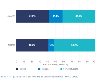 A população negra é a mais afetada pela pobreza nos últimos anos, segundo a Pesquisa Nacional por Amostra de Domicílios Contínua - PNAD: 73% do total de brasileiros que ficaram abaixo da linha de corte em 2021. Dados da mesma pesquisa mostram a distribuição desigual entre brancos e negros no acesso às escolas – 41% contra 51,9%, respectivamente, estão fora da escola.